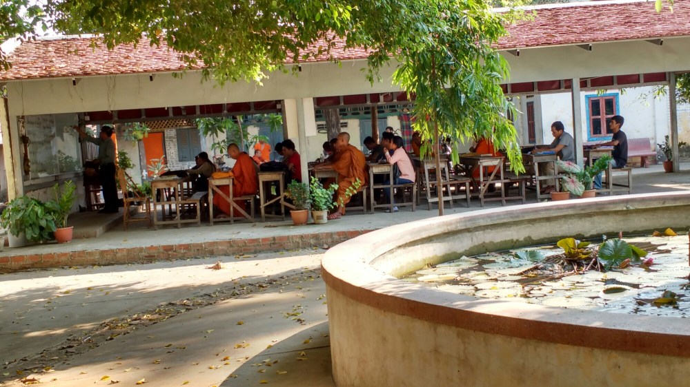 En los recintos de las pagodas residen los monjes. En algunas hay escuelas. Aquí están recibiendo clases de inglés, aunque no todos son monjes.