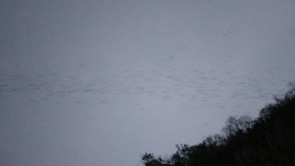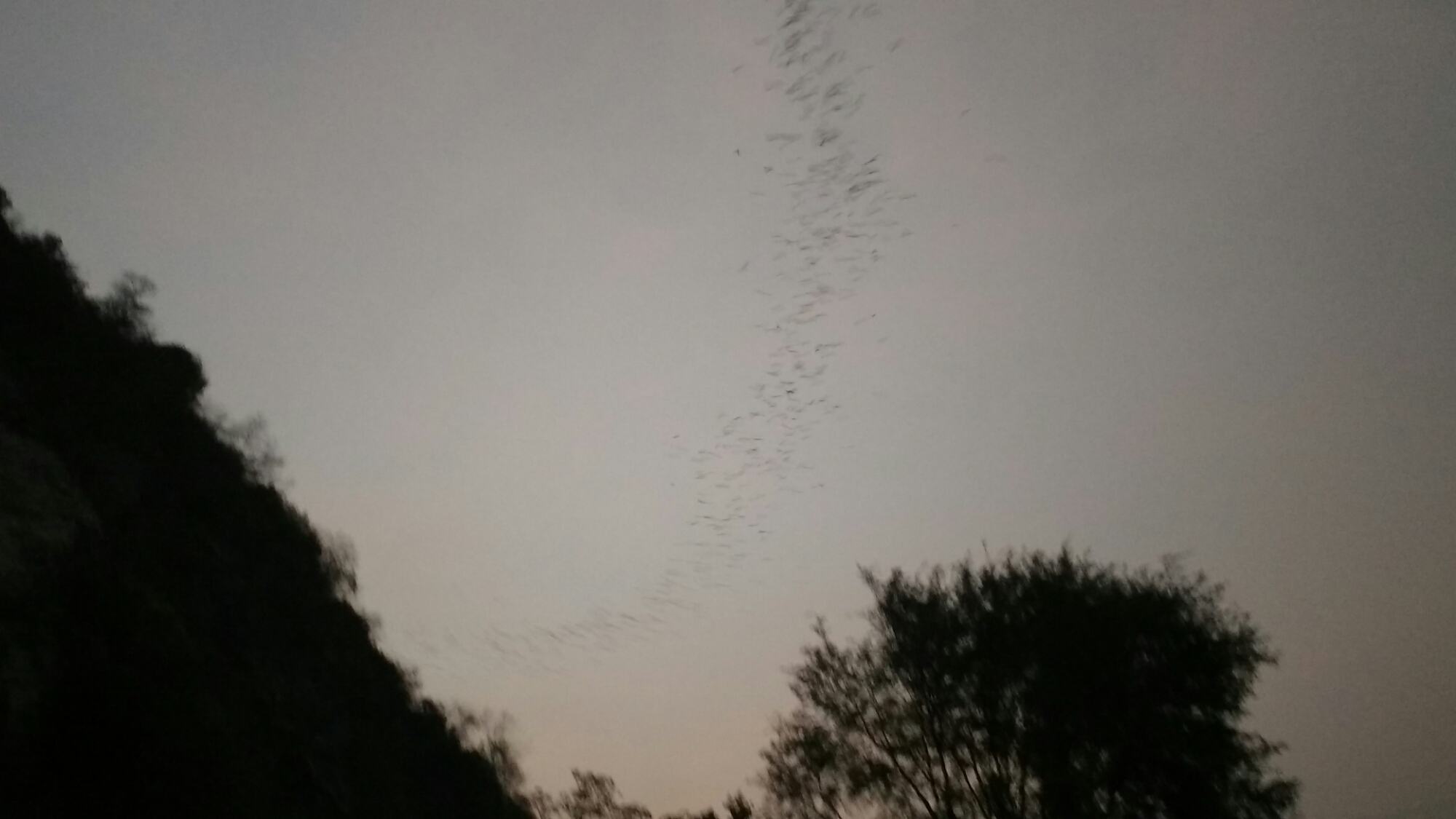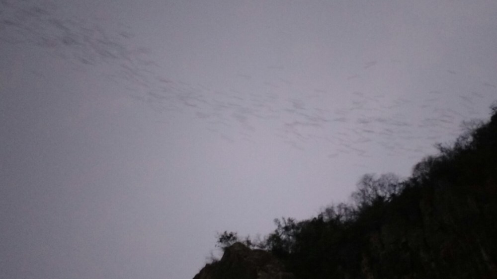 Un número importante de gente nos encontramos delante de la cueva para ver cómo salen. La salida es espectacular, ya que en formación perfecta y de forma continua, fluye una cantidad ingente de estos mamíferos, durante una hora
