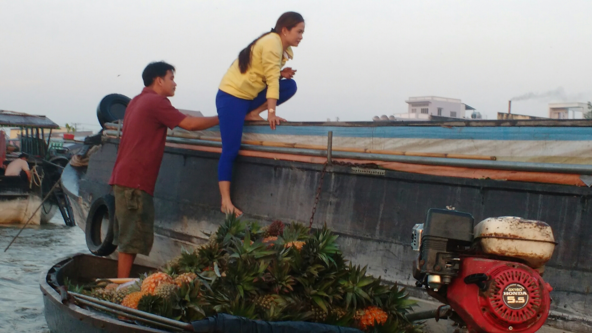 Con el amanecer llegamos al mercado. Este consiste en barcazas llenas de frutas o verduras, que venden sus productos a otras embarcaciones, que se encargarán de la venta minorista.