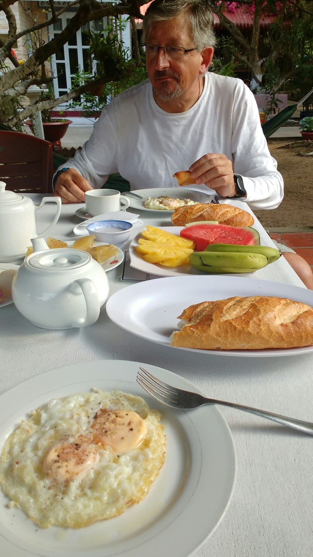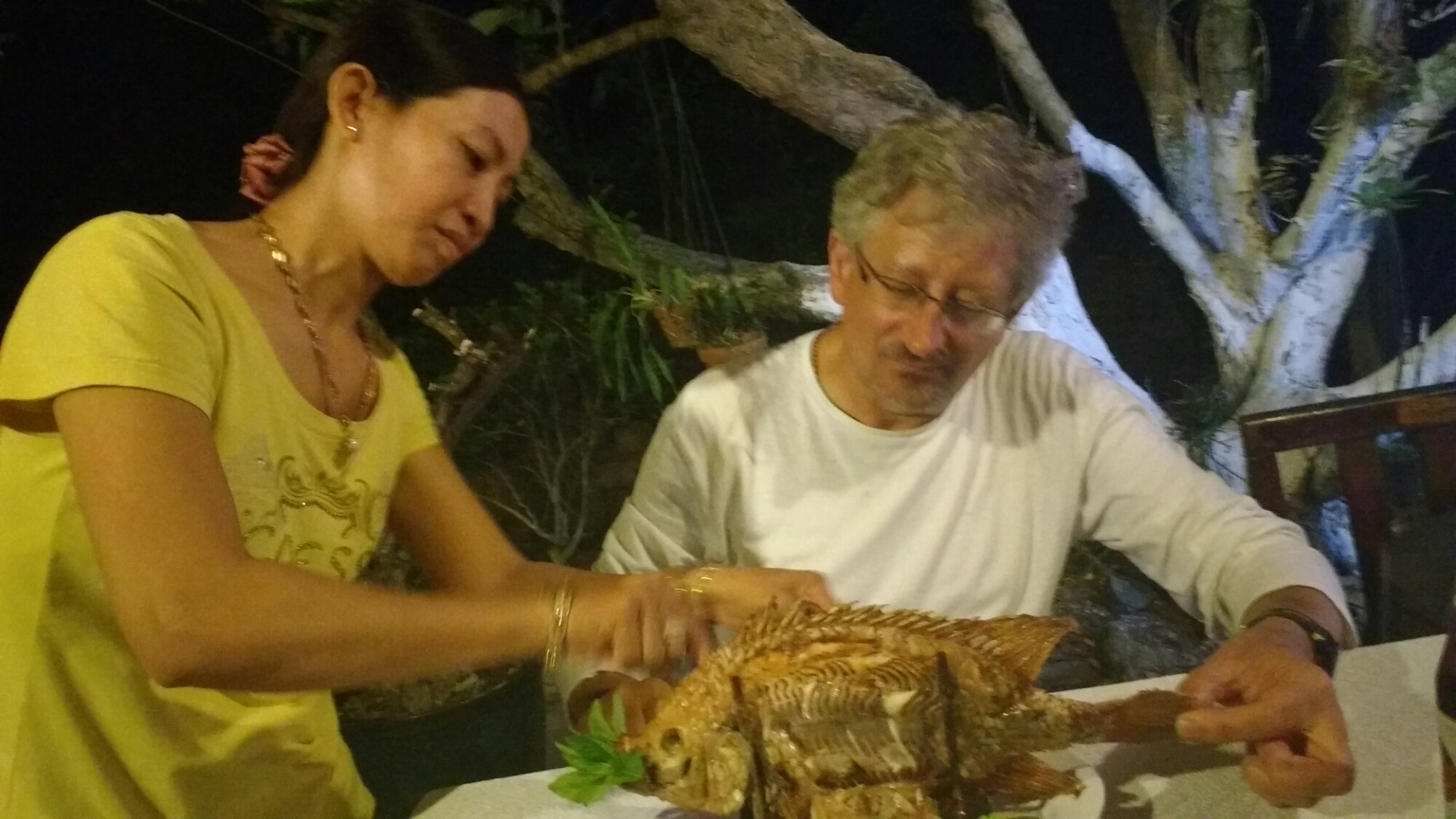 Curiosa manera de servir un pez. Supongo que es sólo para levarlo a la mesa, porque me parece misión imposible limpiarlo en esa posición. Muy bonito Vietnam por ahora