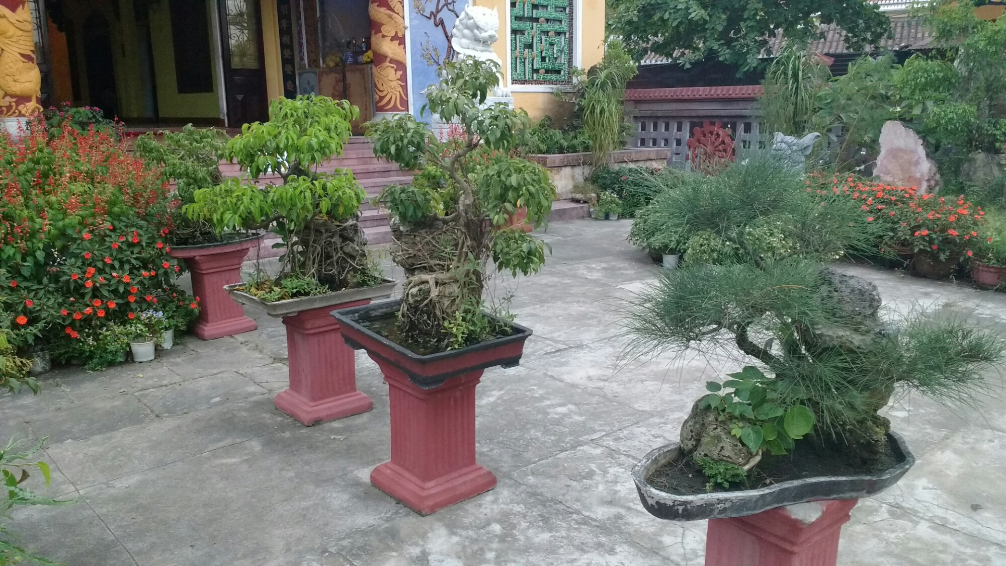 Pagoda con una bonita colección de bonsáis: