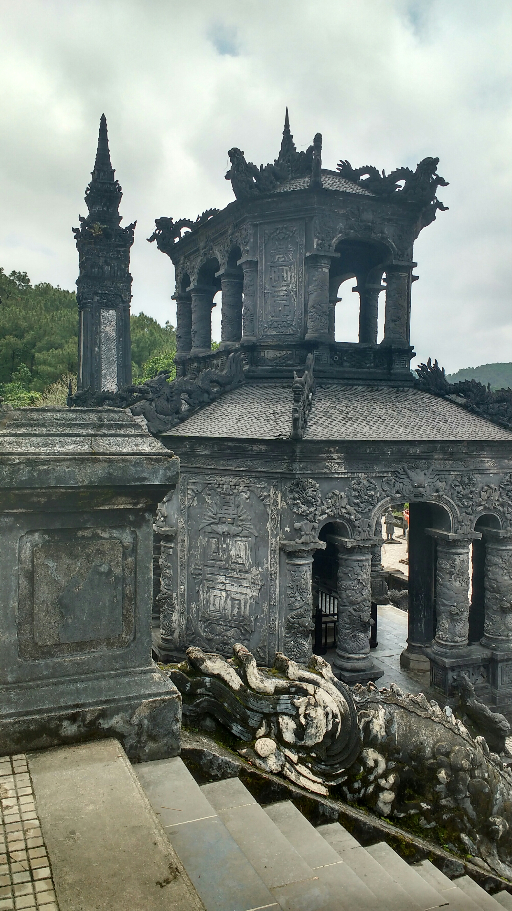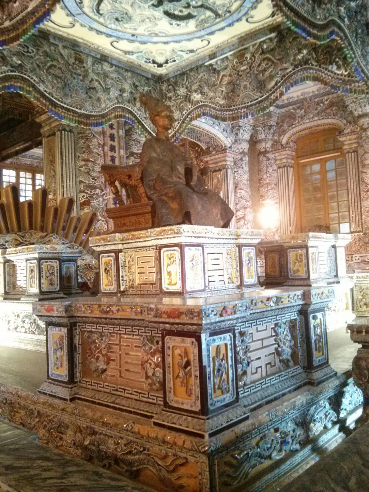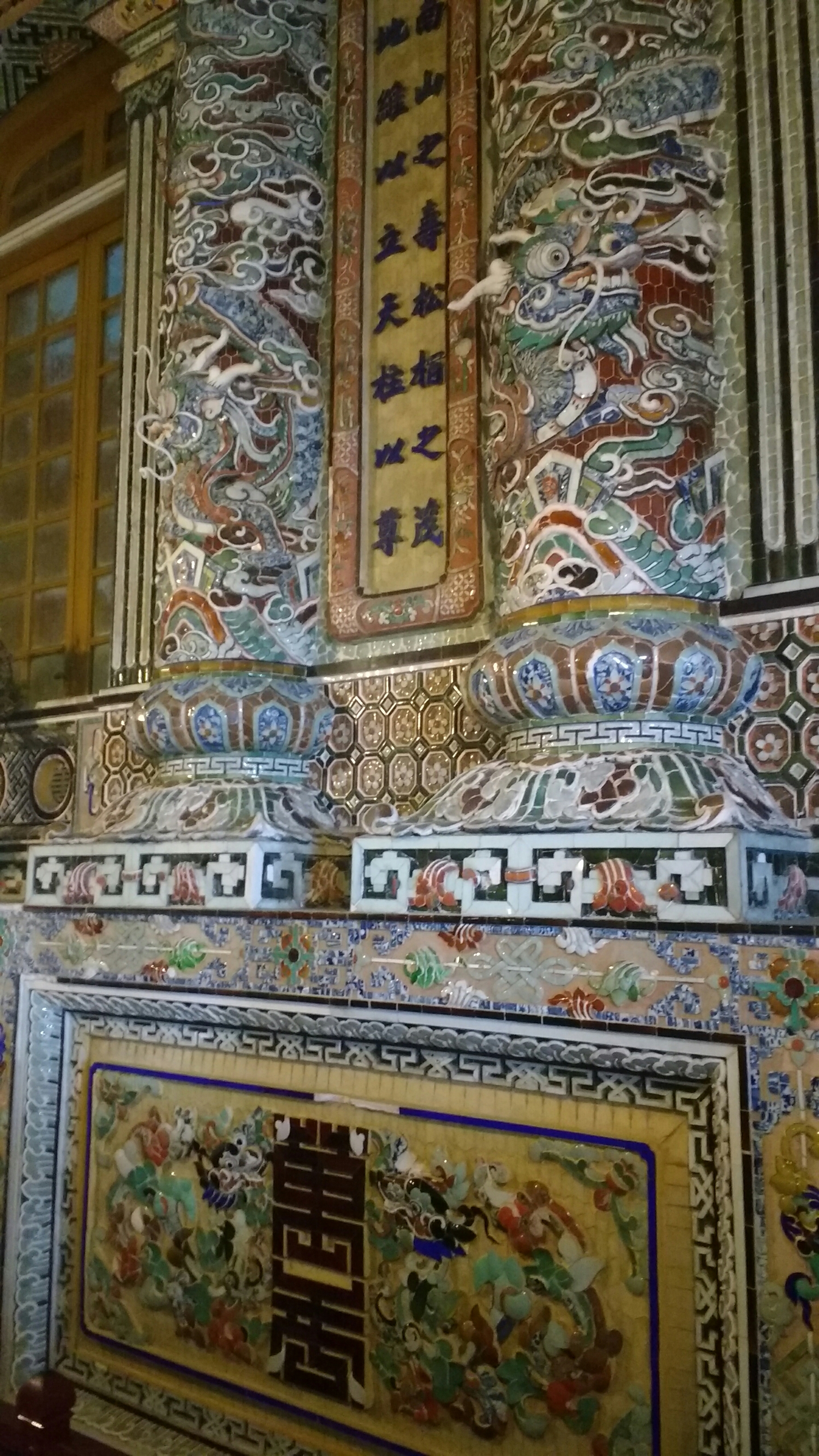 Y por último la de Khai Dinh, que se encuentra en una pequeña superficie, pero es la más espectacular, ya que a lo raro de sus edificios , hay que añadir que el interior del edificio principal es una maravilla, estando todas sus paredes y columnas decoradas con mosaicos.