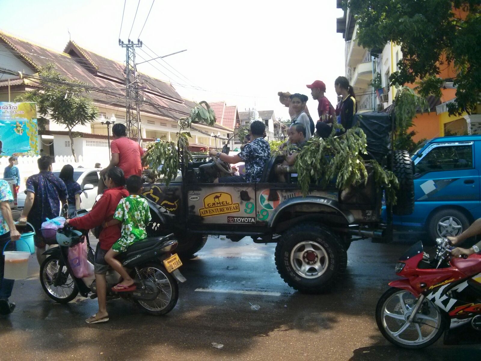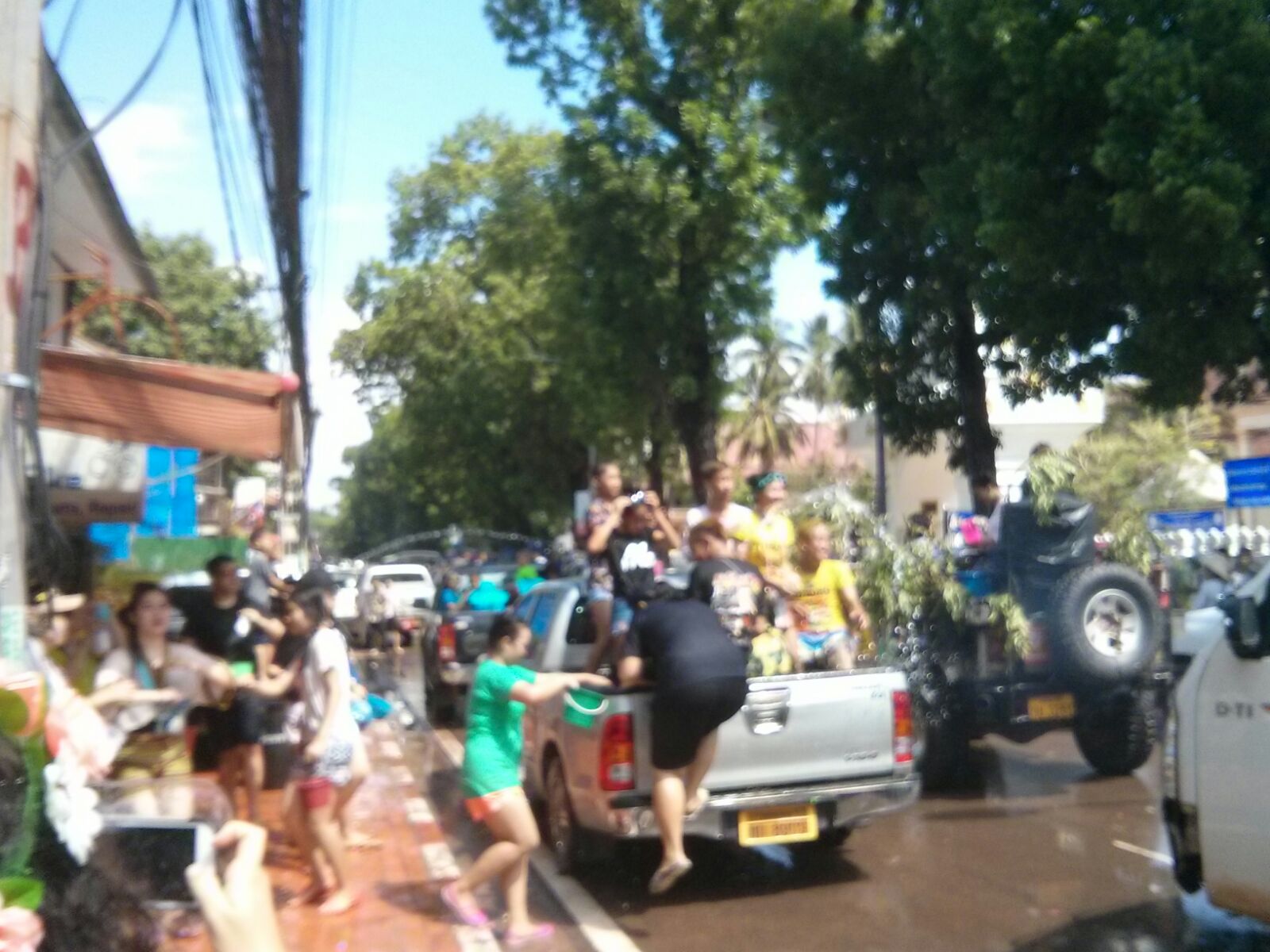 Durante 4 dias, desde primeras horas de la mañana, multitud de grupos de amigos o familiares se dedican a tirar agua, bien desde las aceras, donde se han instalado con mangueras, grandes cubos y piscinas hinchables, o bien desde camionetas con las que recorren las principales calles de la ciudad, a todo el que pillan por delante, incluido a los guiris.
