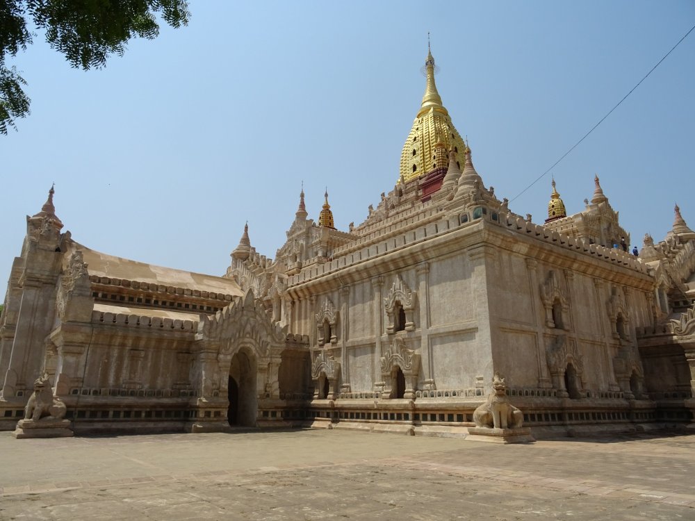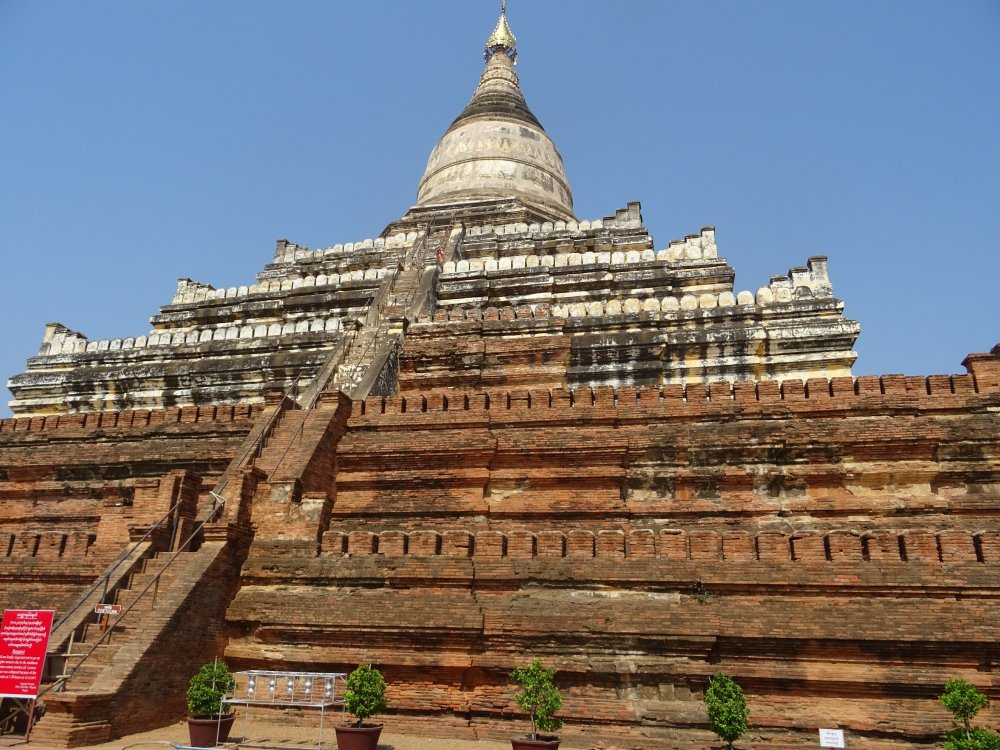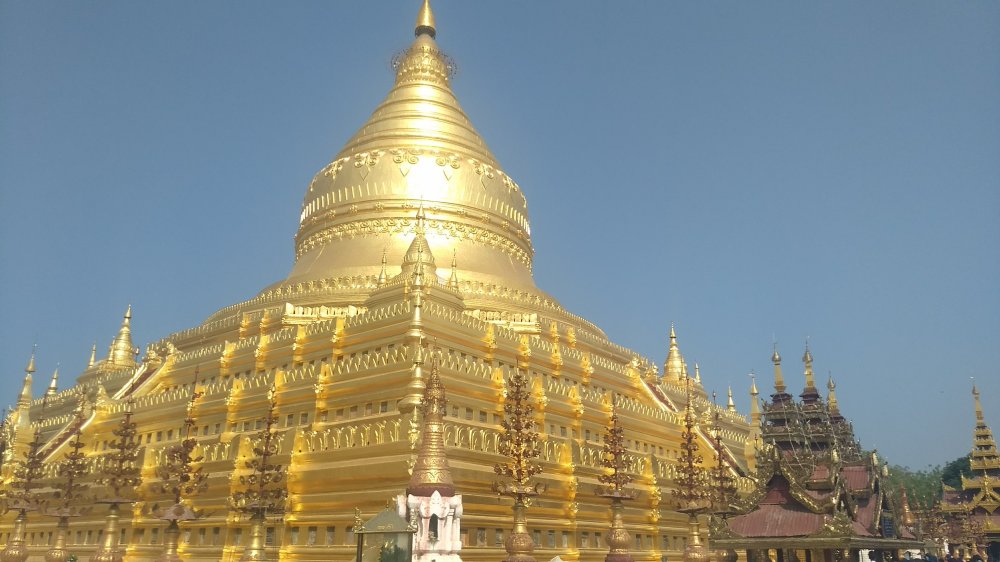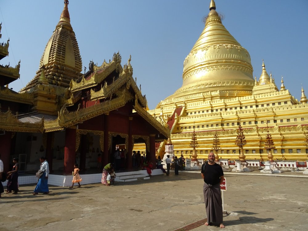 La pagoda Shwezigon, fuera de la zona antigua, es motivo de peregrinación por parte de los fieles budistas.