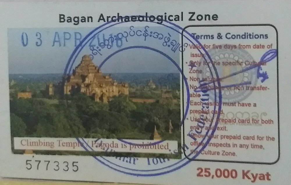 Para poder acceder a Bagan, todos los turistas extranjeros tienen que pagar una tasa de entrada, que en este momento son unos 16€. Si se viaja en autobús, este para en un control, subiendo una persona que te cobra.
